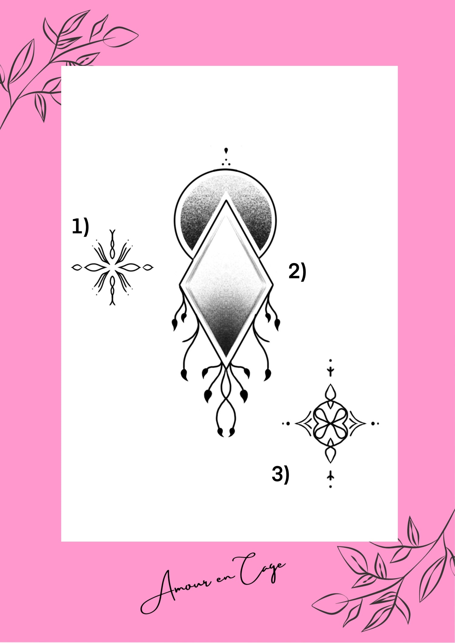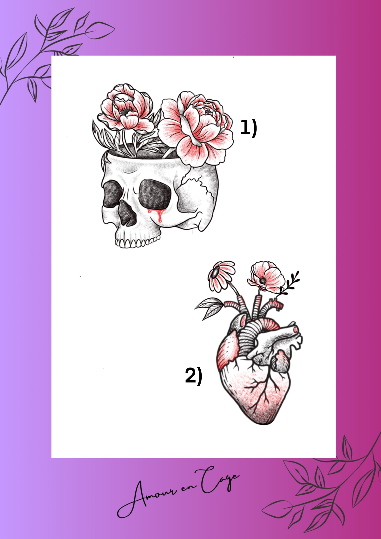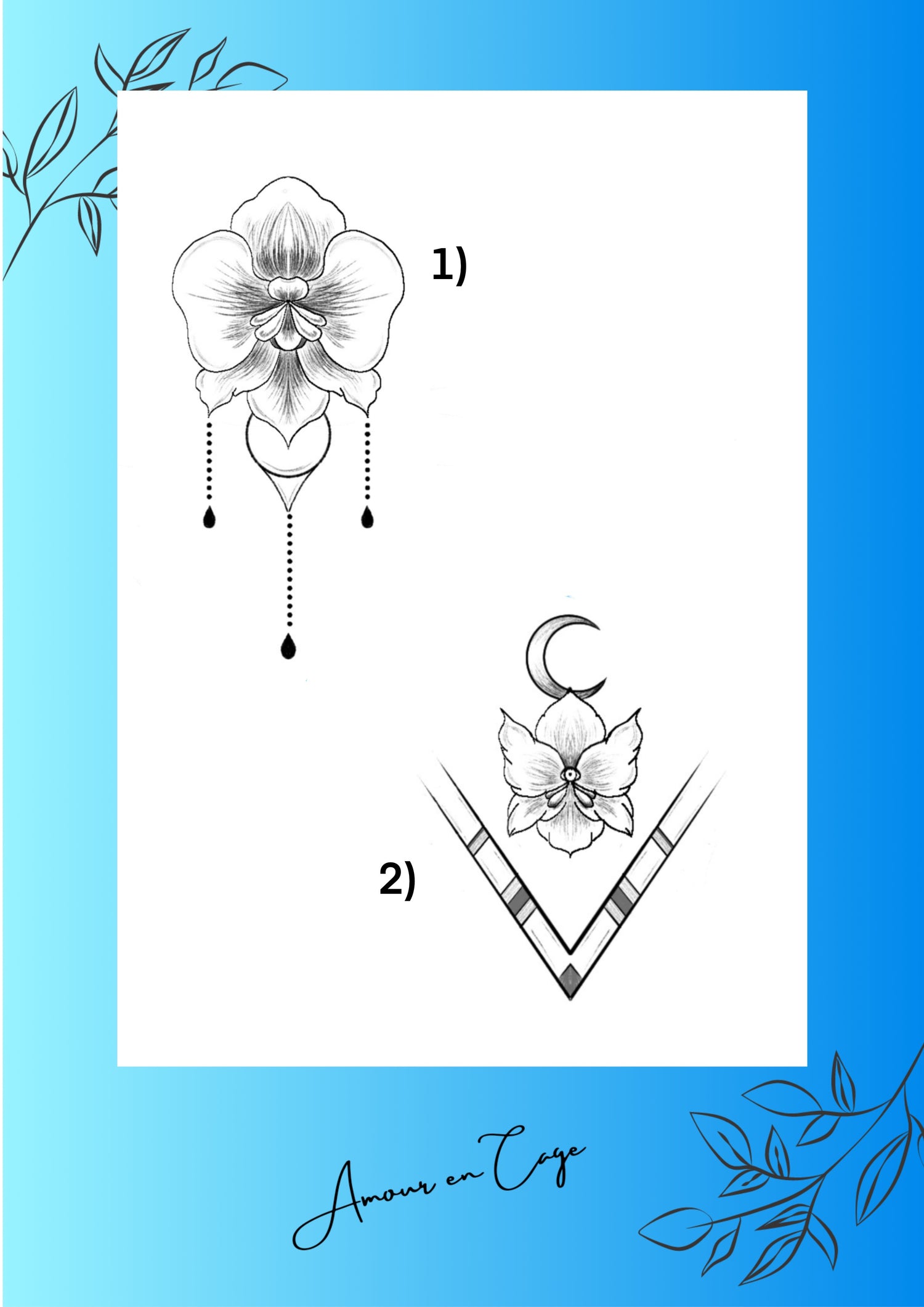 Possibilité en noir et blanc ou couleur. Taille minimum 14cm pour la branche, parfaite pour un avant bras ou un trapèze. Le médaillon est quant à lui pensé pour être sous la poitrine! Merci de préciser le numéro du motif qui vous intéresse dans votre formulaire de demande ;)